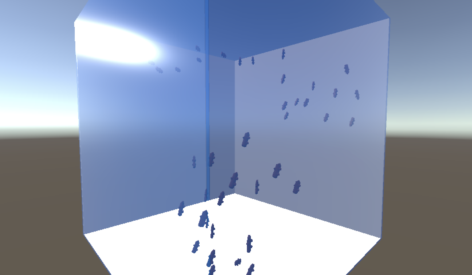 3D Boid-based flocking simulation based on Flocks, Herds, and Schools by Craig Reynolds. Implemented steering rules based on separation, alignment, cohesion, and wander (not in the paper). Integrated merge-and-split mechanism similar to the one in this paper that groups agents based on priximity and velocity similarity. The program allows users to use key binds to manually control boid flock merge and splits.