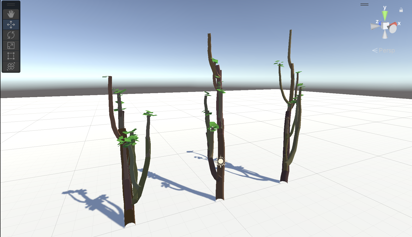 Procedurally generated trees using Frenet frames. This generation supports up to second-order branching, orthotropic/plagiotropic growth, stochastic branching, leaf, and seasonal variations. The mesh was created using joined curved tubes with automatic surface normals for smooth curves.