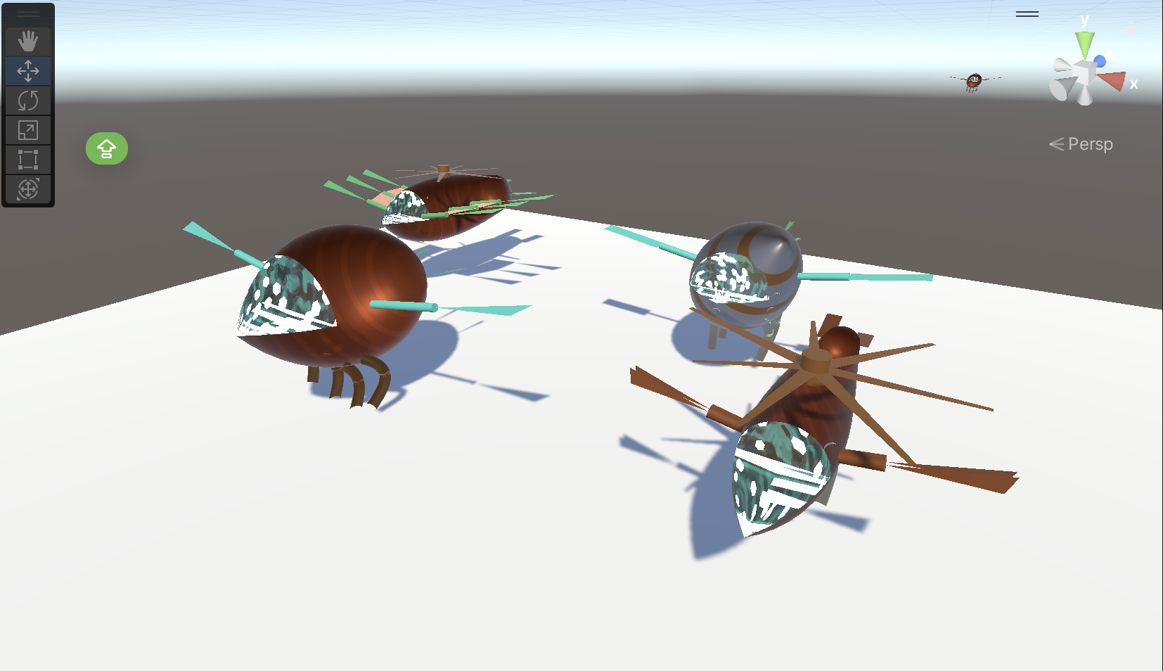 Procedurally generated vehicles based on Thopters from Magic: The Gathering. Thopters are generated using parametric Bezier tube generation. Variations in Thopters come from procedural textures, curved fuselages, limbs, and wings utilizing Perlin noise, normal calculations, and Bezier tubes.
