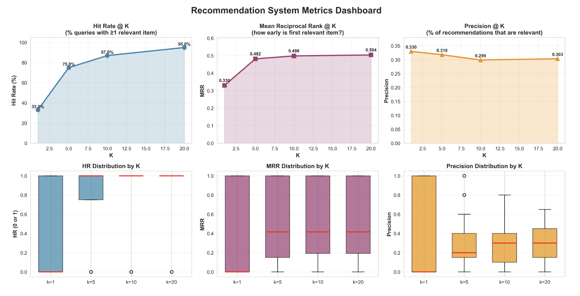 The model also includes quantitative evaluation metrics including hit rate@K, mean reciprocal rank@k, and precision@k. These metrics quantify if relevant results appear in the top k rankings, ranking quality, and recommendation accuracy, respectively.