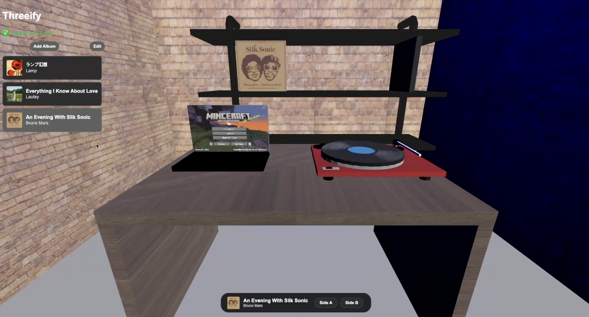 I created the record player in Blender since it had moving parts. Then I made the technically simple (from an implementation standpoint) models in Spline. The textures (wall, text, disc) were all found online. Want to view the room? You can see it here!